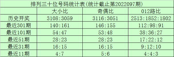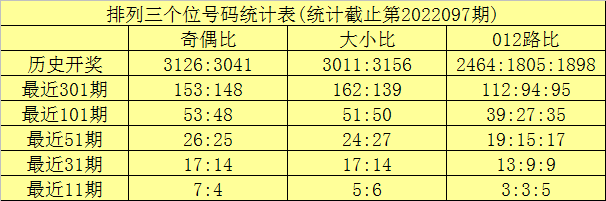 上期回顾:排列三第2022097期奖号为:096。奖号形态组六,大小比2:1,奇偶比1:2,012路3:0:0。