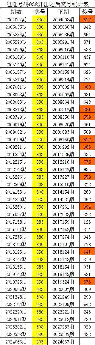 体彩排列三组选号码038历史上出现了44次,其下期奖号分别为:622、942、654、371、538、437、974、623、724、060、081、648、881、559、461、509、622、966、436、775、936、559、873、268、463、994、823、123、814、946、798、141、819、031、581、373、309、290、642、246、780、029、482,详细统计见下表: