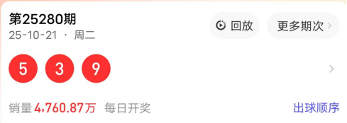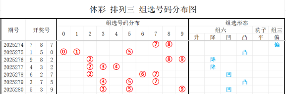 2025280期开奖号码为539,奇偶值为3奇;大小值为2大1小;012路走势为002路;跨度为6跨;和值17点;组六形态。