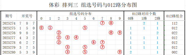 近7期(274~280)开奖号与012路组合分别为787(112)、150(012)、982(022)、432(012)、627(012)、375(012)、539(002),上期开奖号为002路组合,根据整体走势分析,本期看好的012路组合有:012、002、000,防001、022、011路组合。