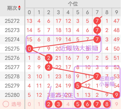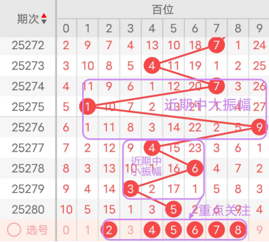 近7期(274~280)开奖号个位号码球分别为7、0、2、2、7、5、9,开奖号与上一期走出的振幅分别为0、7、2、0、5、2、4。274期走出7号大数号码球,走出“0”的小幅度,275期走出0号小数号码球,走出“7”的大幅度,276期走出2号小数号码球,走出“2”的小幅度,277期走出2号小数号码球,走出“0”的小幅度,278期走出7号大数号码球,走出“”5的中大幅度,279期走出5号中大数号码球,走出“2”的小幅度,280期走出9号大数号码球,走出“4”的中小幅度;从近期振幅大小的走势及大小走势来看,中大振幅走在6~7之间较为适宜,中小振幅走在1~4之间较为适宜;结合走势图的整体及大小走势分析,本期个位应重点关注号码球为2、3、5、6、7、8。