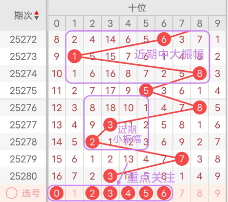 近7期(274~280)开奖号十位号码球分别为8、5、8、3、2、7、3,开奖号与上一期走出的振幅分别为7、3、3、5、1、5、4。274期走出8号大数号码球,走出“7”的大幅度,275期走出5号中大数号码球,走出“3”的中小幅度,276期走出8号大数号码球,走出“3”的中小幅度,277期走出3号中小数号码球,走出“5”的中大幅度,278期走出2号小数号码球,走出“1”的小幅度,279期走出7号大数号码球,走出“5”的中大幅度,280期走出3号中小数号码球,走出“4”的中小幅度;从振幅大小及走势图的整体对应来看,中大振幅走在3~4之间较为适宜,中小振幅走在0~2之间较为适宜;结合走势图的上下对应及振幅大小分析,本期十位应重点关注号码球为0、2、3、4、5、6。