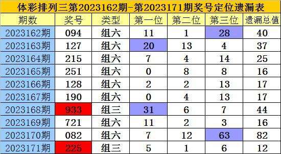 开奖回顾:排列三第2023171期奖号为:225,各位号码遗漏值分别为5、1、6,遗漏总值为12。