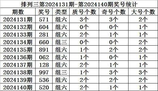 上期回顾:排列三第2024140期开奖:520,质合比为2:1,奇偶比为1:2,大小比为1:2。