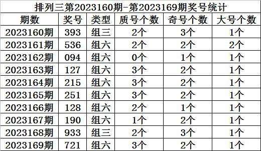 上期回顾:排列三第2023169期开奖:721,质合比为3:0,奇偶比为1:2,大小比为2:1。