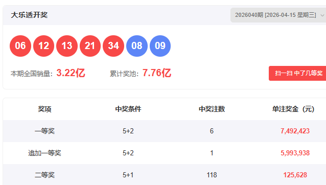 大乐透第2026040期开奖号码如下图: 开出一等奖6注,奖池累计奖金:7.76亿元 ,详细数据见下图: