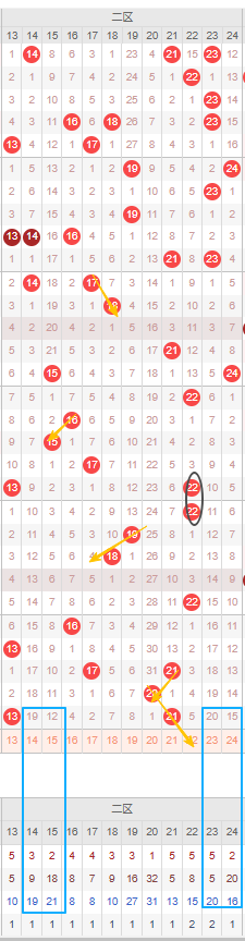 二区本期选号首先考虑冷号14号、15号,如图所示当前两个号都已遗漏十期以上,并且还达到了自身的最大遗漏期数可防冷号开出,23号、24号同样遗漏十期以上,也远超最大遗漏周期,建议都防冷号开出。总之本区多关注冷号就行。由图可见二区的重号几率并不算很大,近20期开出了1次重号,上次开出重号虽然还没间隔很多期,本期也可以考虑上期开出的两个号继续开出重号,但个人不看好继续开重号。邻号可以考虑22号。