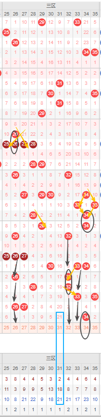 二区选号首先关注冷号31号,已经遗漏了十期以上,且到达自身最大遗漏周期,也已经远超平均遗漏期数,建议可以防冷号开出。另外本期三区个人觉得不会开超过三码,多关注该区冷号防冷号开出。隔断号可以考虑26号,若本期开出将形成1-2-1的形态。其次考虑32号,本期若开出则形成3-3的形态。33号若开出将形成2-2的形态。另外考虑34号重号开出。