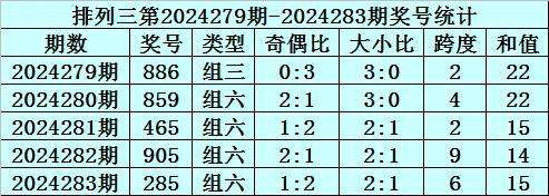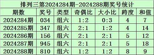 上期回顾:排列三第2024288期开奖号码为810。奖号类型为组六,奇偶比为1:2,大小比为1:2,跨度为8,和值为9。