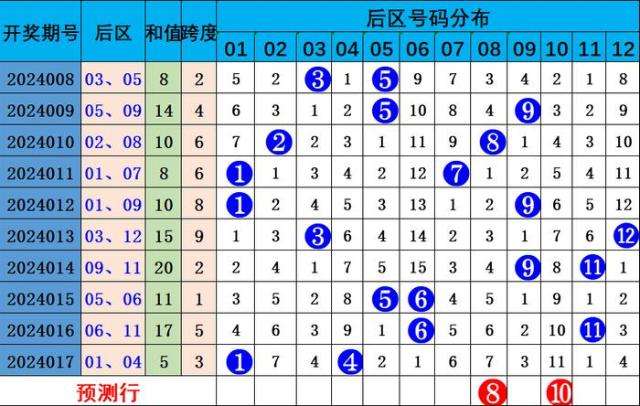 017期开出后区号码:01 04,奇偶组合。近十期奇偶比14:6,近十期奇数较热。综合分析,本期预测偶偶组合开出,本期预测号码:07 08 09 10 12。精准推荐:08 10。