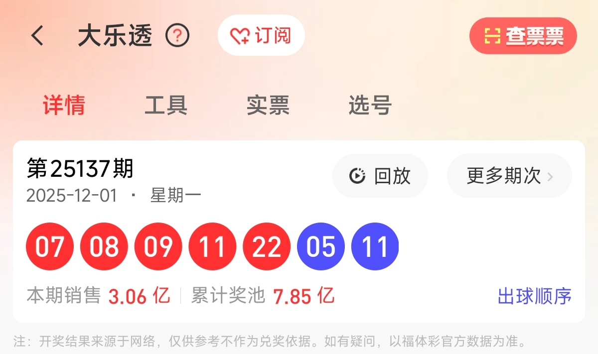 首先让我们回顾一下上期大乐透25137期的开奖为07、08、09、11、22,蓝球05、11。前区和值57,前区跨度15,区间比为4:1:0,奇偶比为3:2。