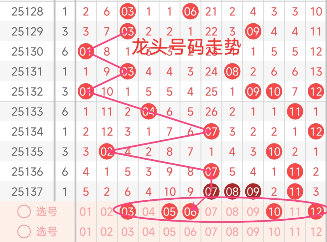 上期龙头号码为07,开出重号,振幅为零点,开出奇数号码。从近期龙头号码的走势来看,近期龙头号码波动频繁。上期龙头是07,近期龙头号码呈现出在小数区域波动的态势,且多集中在01 - 10之间。从走势来看,本期龙头号码可能会继续在这个区间内选择,考虑到号码的交替性,预计本期龙头号码重点关注01-12区间开出。本期还需注意连续多期漏出的号码,需重点关注,有回补龙头号码的趋势。 综合考虑,本期龙头号码推荐关注:03、05、06、10、12。