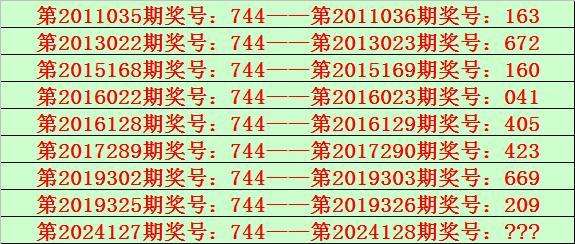 排列三第2024127期开出奖号744,该号码直选类型历史上出现了9次,前8次开出之后期下期奖号为:163、672、160、041、405、423、669、209,见下表: