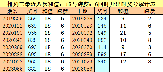 体彩排列三最近八次同时出现和值:18与跨度:6的奖号分别为:369、639、936、828、693、693、963、882,前七次下期开出奖号分别为:234、248、849、082、414、593、840,详见下表: