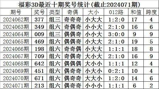 开奖回顾:福彩3D第2024071期奖号为213,奖号形态为:组六、小小小、1:1:1、偶奇奇。