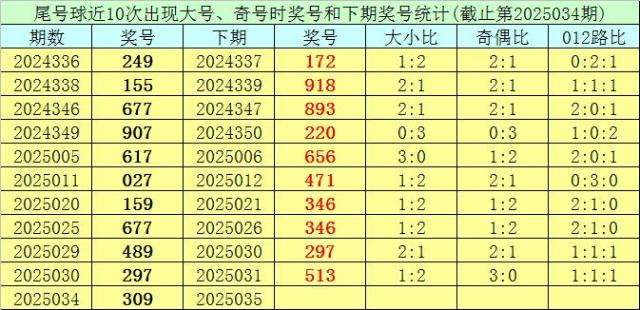 在尾号球前10次开出大号、奇号类型之后,其下期分别开出奖号:172、918、893、220、656、471、346、346、297、513,其中号码奇偶比为4:6,大小比为5:5,012路比为6:2:2。