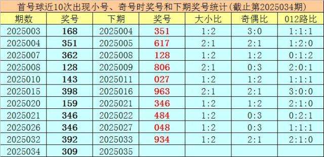 在首号球前10次开出小 号、奇号类型之后,其下期分别开出奖号:351、617、128、806、027、963、346、484、048、934,其中号码奇偶比为5:5,大小比为4:6,012路比为7:2:1。