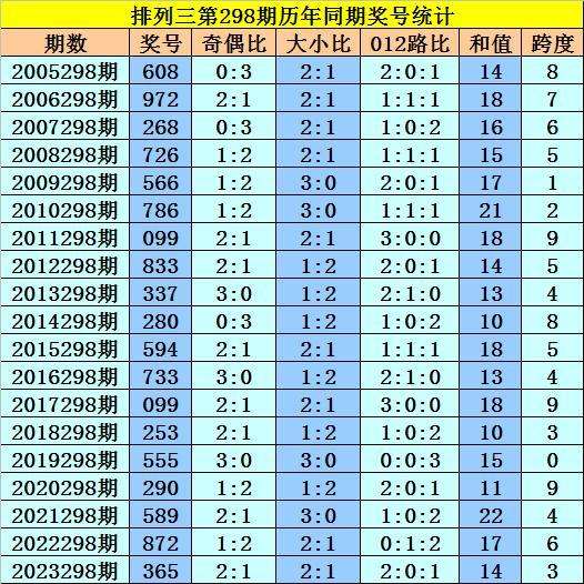 本期为排列三第2024298期开奖,历史上排列三第298期已开出了19期奖号了: