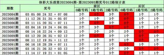 上期回顾:大乐透第23093期奖号为:11 14 17 19 21+01 05,其中前区号码012路比为1:1:3,后区号码012路比为0:1:1。