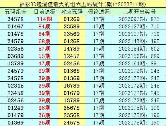 1。截止第23211期,五码组六遗漏最大的是:34578,当前遗漏114期。