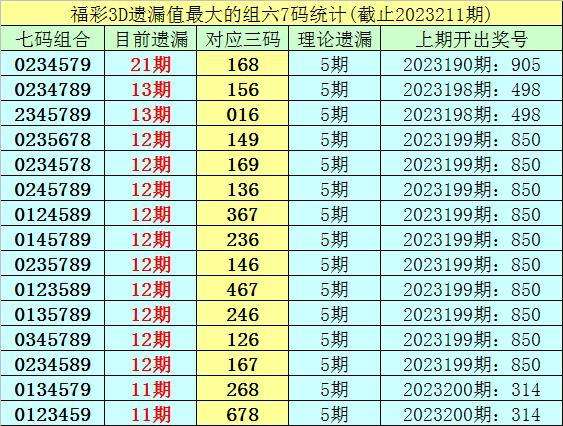 1。截止第23211期,七码组六遗漏最大的是:0234579,当前遗漏21期。
