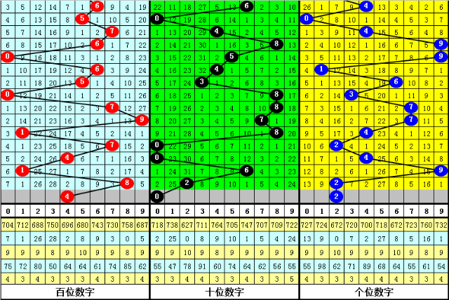 一、在下期开奖中,百位号码奇偶比为5:2,大小比为6:1,012路比为0:2:5,本期百位注意号码:0、4、7,胆码注意1路号码:4。