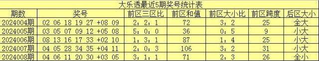 大乐透第2024008期奖号为,前区:04、06、11、20、30;后区:03、05。其中前区奖号大小比为2:3,三区比为3:1:1,和值为71,跨度为26。