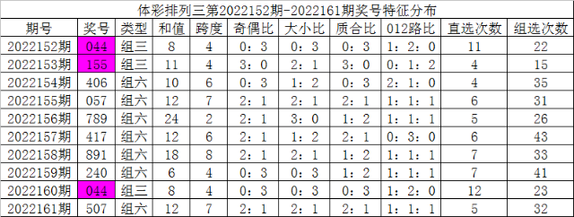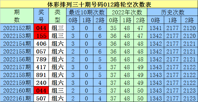 开奖公告:体彩排列三第2022161期开出奖号:507。组六,有重号:0,奇偶比2:1,大小比2:1,012比1:1:1,和值12,跨度7。