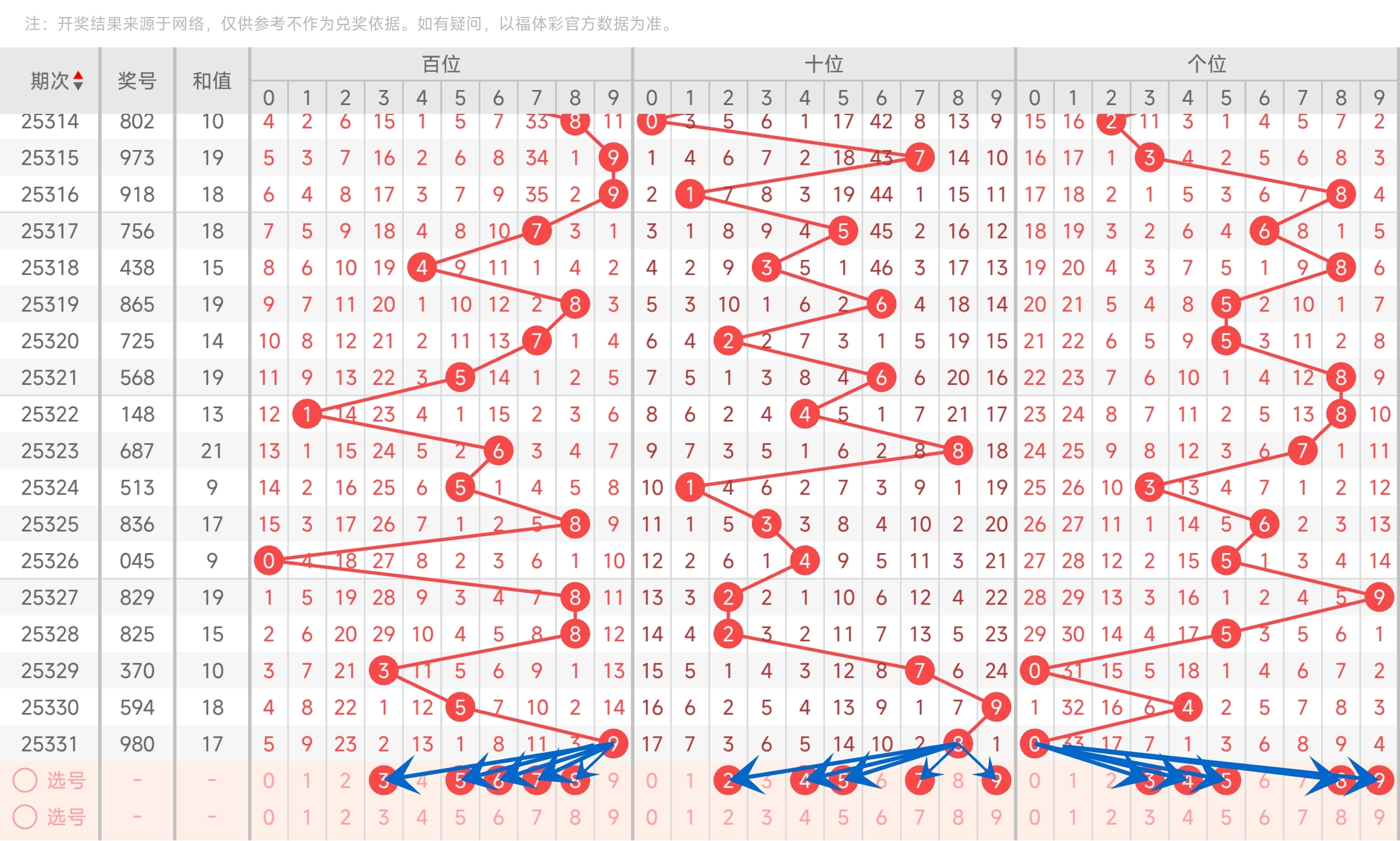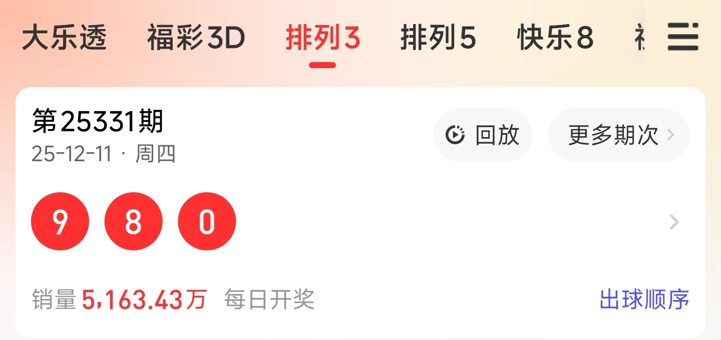 上期排列3开出980,和尾为7,跨度为9,奇偶比为1:2,大小比为2:1,012路个数对比为2:0:1。