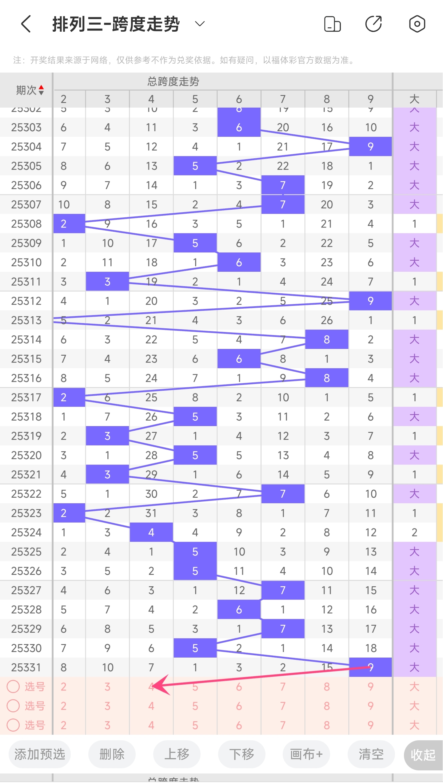 上期跨度为9,往前一期跨度是5,趋势往右移动,偏移量为4。跨度值9时,跨度值是近30期内开出最大的值。通过走势图分析,目前的趋势是大概率往左,小概率不动。所以推测本期跨度可能为34567等跨度。