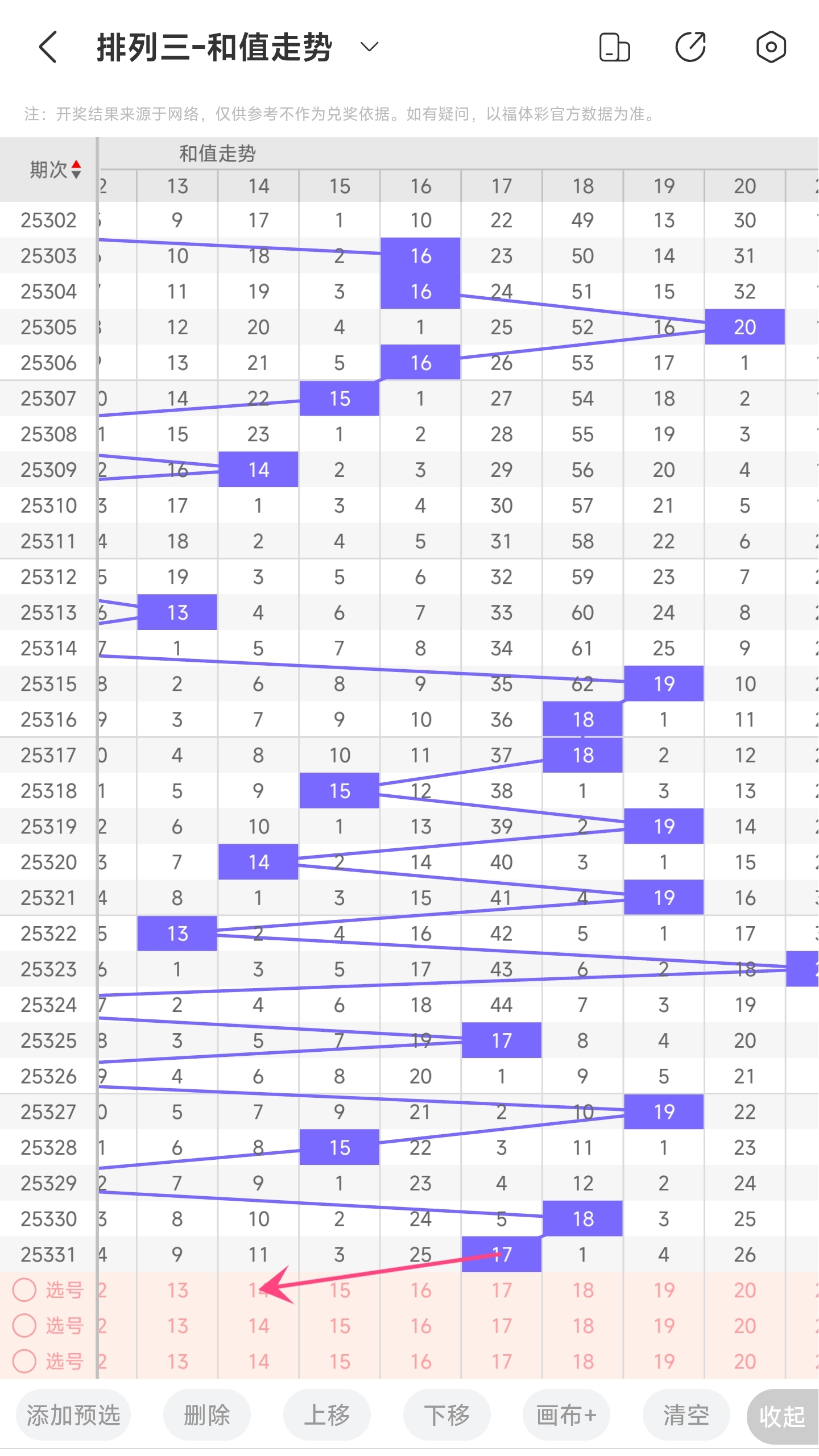 上期和值为17,往前一期和值为18,趋势往左移动,偏移量为1。通过走势图分析,17和值是近30期内开出比较大的和值,下降空间比较大,上升空间比较小。本期看好和值变小,因此推测本期趋势是往左的,和值会变小,小概率往右,和值变大。