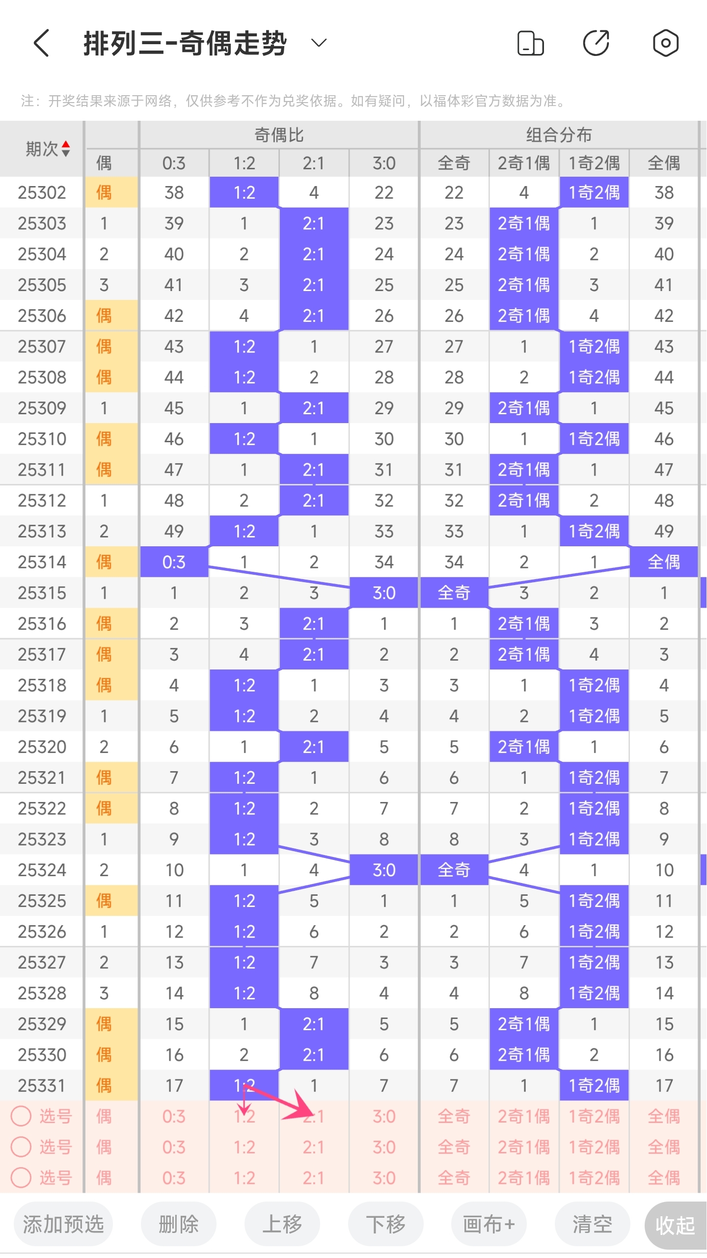 上期开出了1:2的奇偶比。往前一期是2:1奇偶比。通过分析奇偶走势图,近30期内开出1:2奇偶比的次数是15次,开出2:1奇偶比的次数是12次,3:0是2次,0:3是1次。和前一期相比,次数没有发生变化。通过走势图分析,1:2奇偶比很热门,本期有可能继续开出。所以推测本期可能开1:2奇偶比,其次是2:1奇偶比,最后是3:0或者0:3奇偶比。