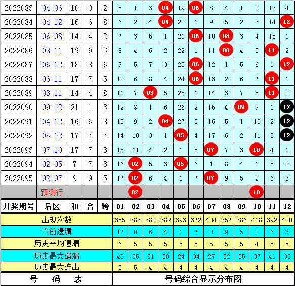 石浩第2022096期大乐透后区分析:后区上周星期一后区奖号为07和10,上期开出奖号02和07,最近9周星期一与最近9期后区奖号大小比分别为12:6和10:8,奇偶比分别为9:9和8:10,本期看好后区出现全偶组合,关注号码02、06、08、10。
