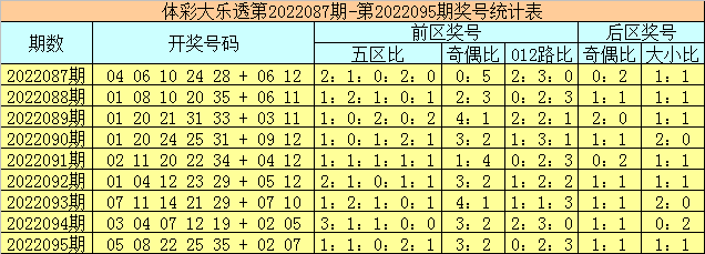 体彩大乐透第2022095期奖号为05 08 22 25 35 + 02 07,前区号码五区比为1:1:0:2:1,奇偶比为3:2,012路比为0:2:3,后区号码奇偶比为1:1,大小比为1:1。