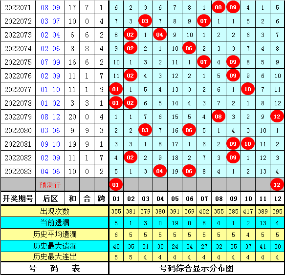 其中,后区012路比5:7:8,奇偶比9:11,大小比11:9,本期一码看好12。