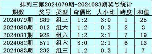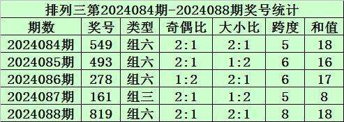 上期回顾:排列三第2024088期开奖号码为819。奖号类型为组六,奇偶比为2:1,大小比为2:1,跨度为8,和值为18。