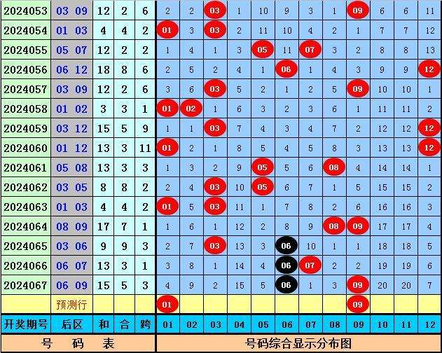 后区分析:上期后区奖号为06+09,开出一大一小组合,上周六后区奖号开出03+06,最近十周六后区奖号大小比为8:12,小号表现比较活跃,本周六继续关注小号出现,看好一大一小组合,参考两码01、09。