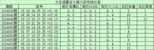 前区奇偶走势:上期前区奇偶比为2:3,上周六前区奇偶比2:3,最近十周六奇数号码表现占优,本期注意偶数号码回补转热,关注奇偶比1:4。