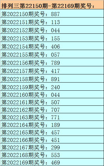 开奖回顾:排列三第2022169期开出奖号:469。其中奖号大小比为2:1,奇偶比为1:2,012路比为2:1:0,和值为19,跨度为5。