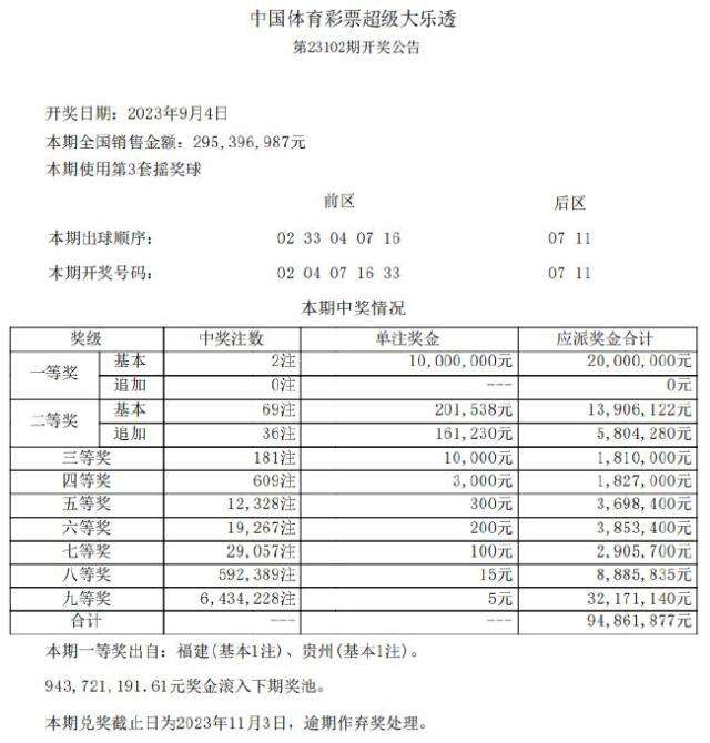 北京时间9月4日晚,大乐透第23102期开奖。当期开奖号码为前区02 04 07 16 33,后区07 11。