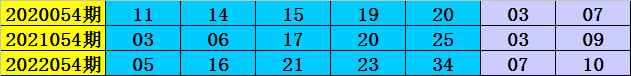 在2020054期-2022054期同周期奖号中,前区连码出现1期,同尾号出现0期,号码奇偶比9:6,大小比7:8,号码012路比4:4:7,前区开出14个号码。
