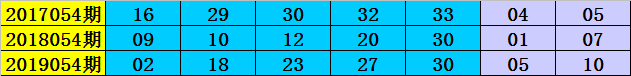在2017054期-2019054期同周期奖号中,前区连码出现2期,同尾号出现1期,号码奇偶比5:10,大小比10:5,号码012路比8:2:5,前区开出13个号码。