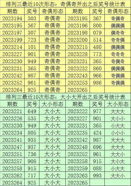 排列三最近10次同时开出奇偶形态:奇偶奇和大小形态:大小大时其奖号分别为:545-745-747-525-925-527-929-709-707-949-925,下期分别开出号码为:153-292-861-287-739-920-791-711-765-365,详细统计见下表: