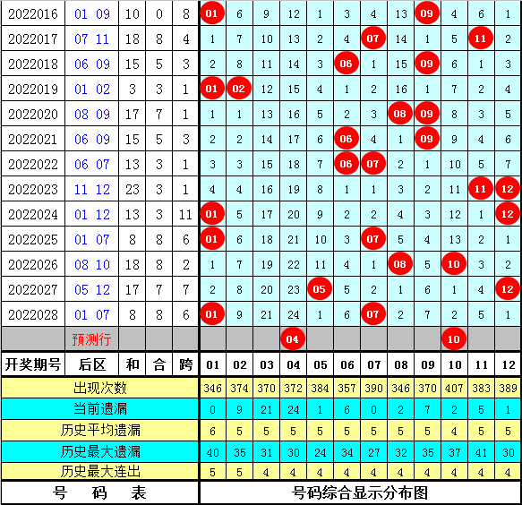 后区上期两码开出01和07,其号码遗漏值为2期+2期,本期后区重防冷码解冻,四码参考04、05、06、10,两码关注04和10。