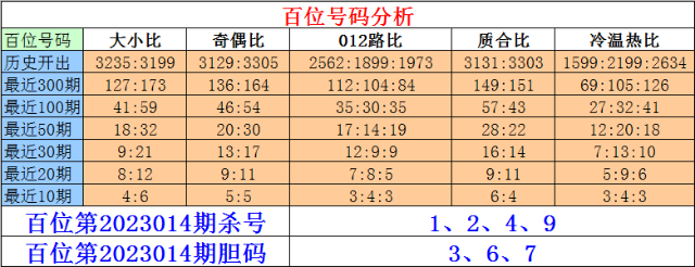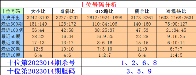 近期十位奇数出现较少,目前遗漏5期,本期适当关注奇数出现;该位温冷号码近期出现较少,目前轮空3期,本期注意温冷号码解冻。十位杀号:1268,胆码关注:359。