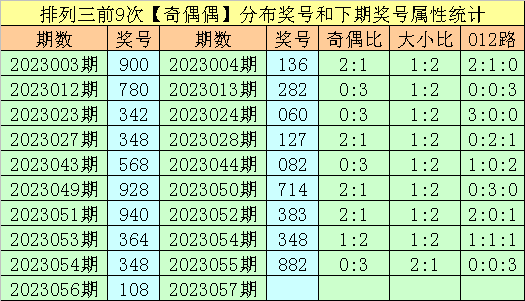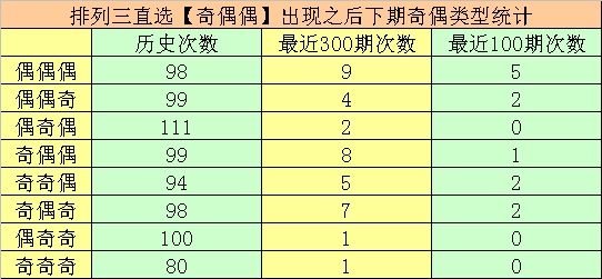 排列三第2023056期奖号为108,直选奇偶分布为:奇偶偶,该奇偶分布历史上共出现了780次,前100期出现13次。