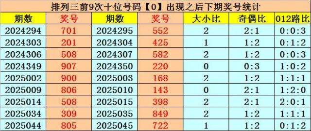 十位号码:十位上期开出偶数、大号、0路号码:0,历史上十位号码0共开出701期,上一次出现在第2025044期,上期奖号遗漏值为2期。