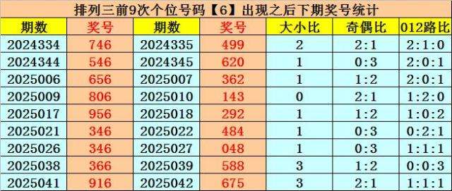 个位号码:上期奖号为大号、偶数、0路号码:6,历史上个位号码6共开出713期,前一次出现在第2025041期,上期遗漏5期再出。