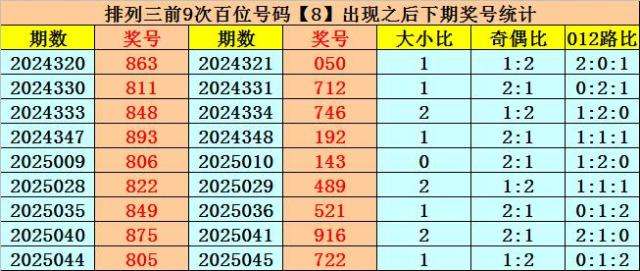 百位号码:百位上期奖号为0路、偶数、大号:8,历史上百位号码8共开出761期,前一次开出期数在第2025044期,上期奖号隔2期再次开出。