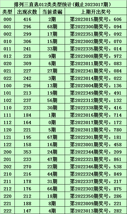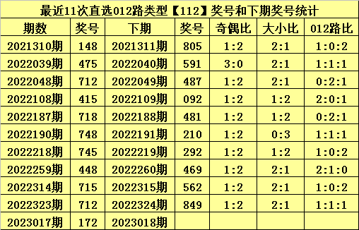 上期回顾:体彩排列三第2023017期开出奖号:172,其012路比为0:2:1,奖号012路类型为:112。